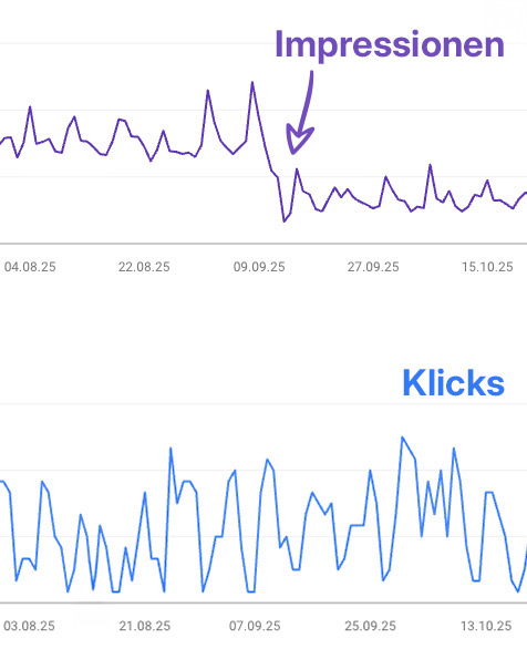 Ab dem 10. September 2025 verzeichneten Websites branchenübergreifend einen Rückgang der Impressionen um bis zu 50 Prozent in der Google Search Console. Besonders betroffen sind E-Commerce-Websites und dienstleistungsorientierte Unternehmen. Diese Entwicklung war nicht graduell, sondern trat nahezu über Nacht ein – ein klares Zeichen für eine systematische Änderung seitens Google.